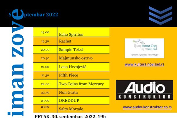 Pozivamo sve novosađane da dođu i čuju nove muzičke nade. Bendovi koji će u petak 30. septembra izaći pred novosadsku publiku su: Echo Spiritus, Salto Mortale, Fifthe Piece, Sample Tekst, Majmunsko ostrvo, Rachet, Two coins from Mercury, Non Grata, DREDDUP i mlada kantautorka Lena Hrvojević.